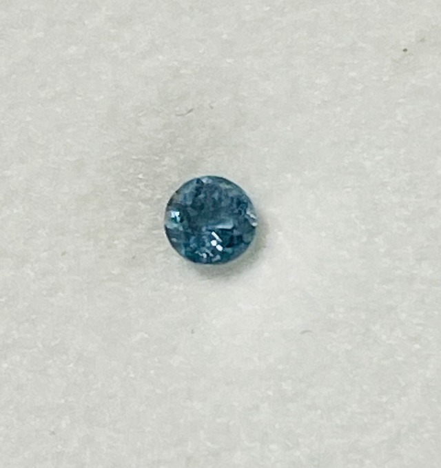 アイスブルーダイヤモンド(トリートカラー) ラウンドブリリアントカット トータル0.08ct 2.1㎜R 人工的に着色された淡いブルーカラーのダイヤモンド。 ルーペで見ると液膜っぽいインクルージョンが確認できますが、肉眼では 目立たず照りの良いダイヤモンドです。 2枚目の写真が裏側です。