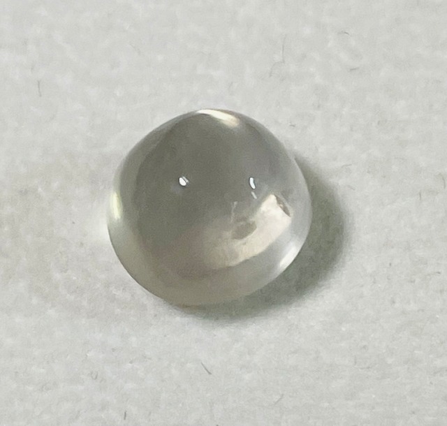 ムーンストーン ラウンドカボション 4.97ct 10.4×9.9×7.3 インド産 背の高いコロンとしたカボション。シラーが出やすい様、少し先がとがっています。 透明度は比較的高く、ふんわりとした白いシラーが出ます。 丸いクラックインクルージョンが見られますが、透明度は比較的高いです。 3枚目の写真が裏側です。