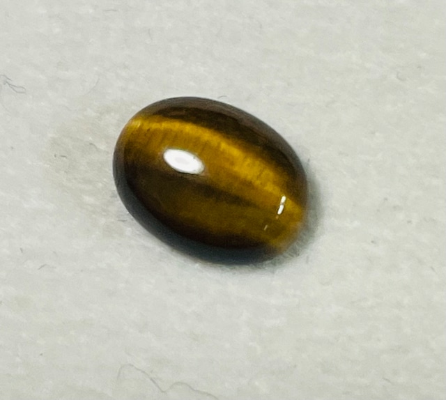 タイガーアイ OVカボション 1.55ct 8.9×6.8×3.1 金運の石として知られるタイガーアイは、クォーツに石綿(アスベスト)が 含有されたもの。アスベストの繊維でキャッツアイが見られます。 (しっかり含有されているので、溶けだしたりして有害なことはありません) 脱色したり(うすい黄土色)、更に染色されているもの(赤とか緑とか)もありますが、 このルースは天然の色です。不透明で照りの良いきれいなルースです。 キャッツアイもきれいに入ってカットもなめらかです。 3枚目の写真が裏側です。