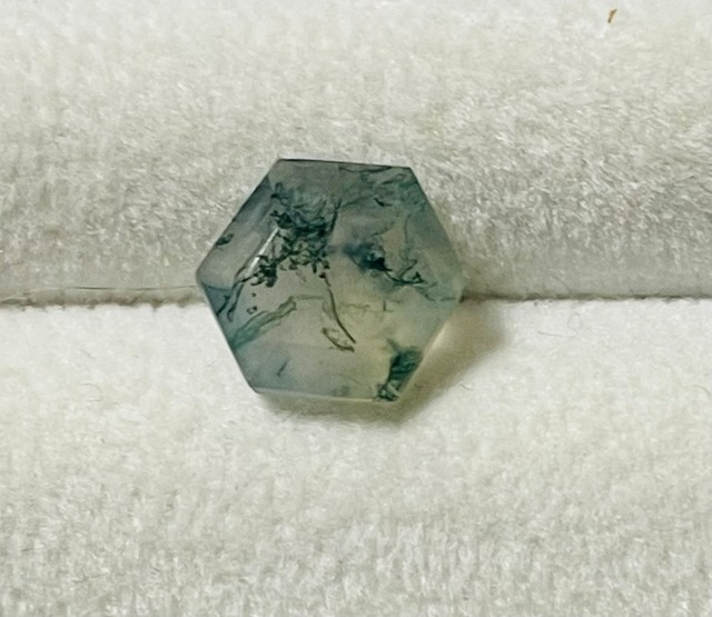モスアゲート ヘキサゴンカット 1.76ct 9.2×9.2×4.0 インド産 半透明のアゲートにクローライトインクルージョンが藻のように入っている 池を覗き込んだようなルースです。 クローライトと白地のバランスが良いです。 カットもおおむねきれいです。 3枚目の写真が裏側です。