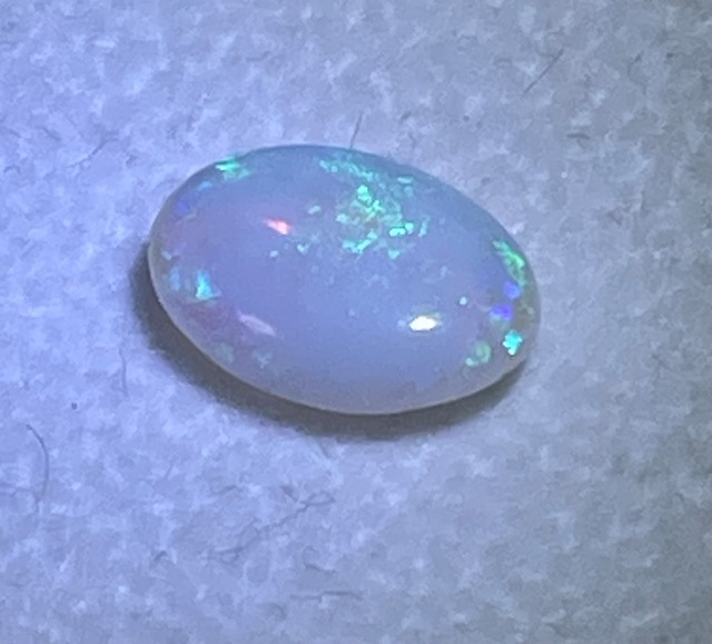 ホワイトオパール OVカボションカット 1.34ct 10.3×7.4×2.8 オーストラリア産 半透明の乳白色の地に青や緑色の遊色が出ます。 少しへこみと黒いインクルージョンはありますが、おおむねなめらかな カットです。 3枚目の写真が裏側です。