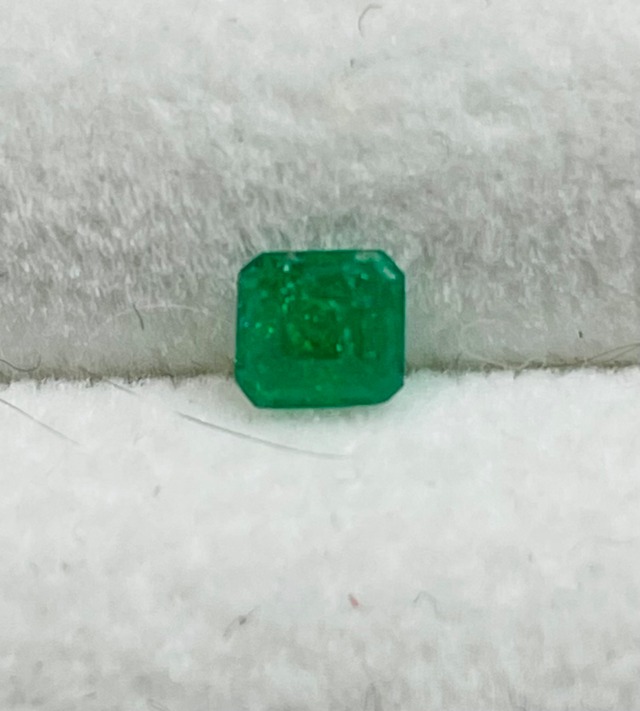 エメラルド エメラルドカット 0.13ct 3.1×3.0×1.4 コロンビア産 色は濃い目で綺麗なエメラルドグリーン。 カットが少しいびつで、液体などのインクルージョンが非常に多く 半透明に近いです。チップ(微細なカケ)も見られます。 3枚目の写真が裏側です。