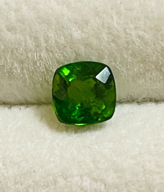 グリーンダイオプサイド クッションカット 0.60ct 4.8×4.8×3.0 ロシア産 鮮やかなグリーンのダイオプサイド。カットも綺麗です。 細かい液体インクルージョンが帯のように入っていてきれいです。 透明度はそこそこあります。 3枚目の写真が裏側です。