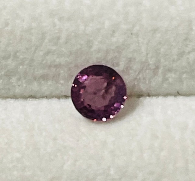パープルスピネル ラウンドカット 0.21ct 3.5×3.5×2.1 ロードライトガーネットのようなピンク味のあるパープル。 照りありますが、カットがややいびつでガードルにチップがあります。 インクルージョンは少ないですが、端の方に結晶インクルージョンが見られます。 3枚目の写真が裏側です。