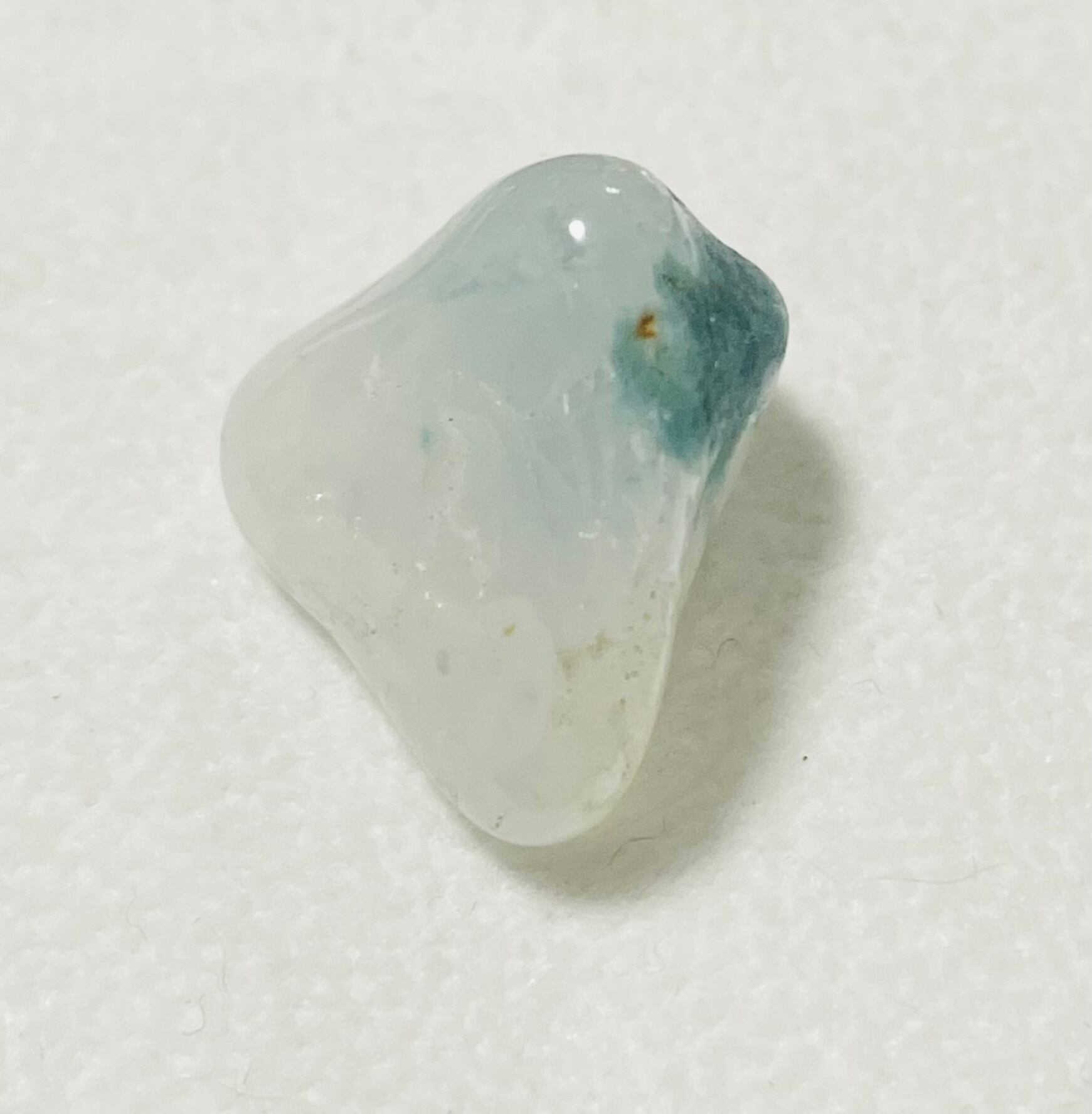 乳白色の半透明のクォーツに、一部ブルーグリーンのアパタイトが入っています。