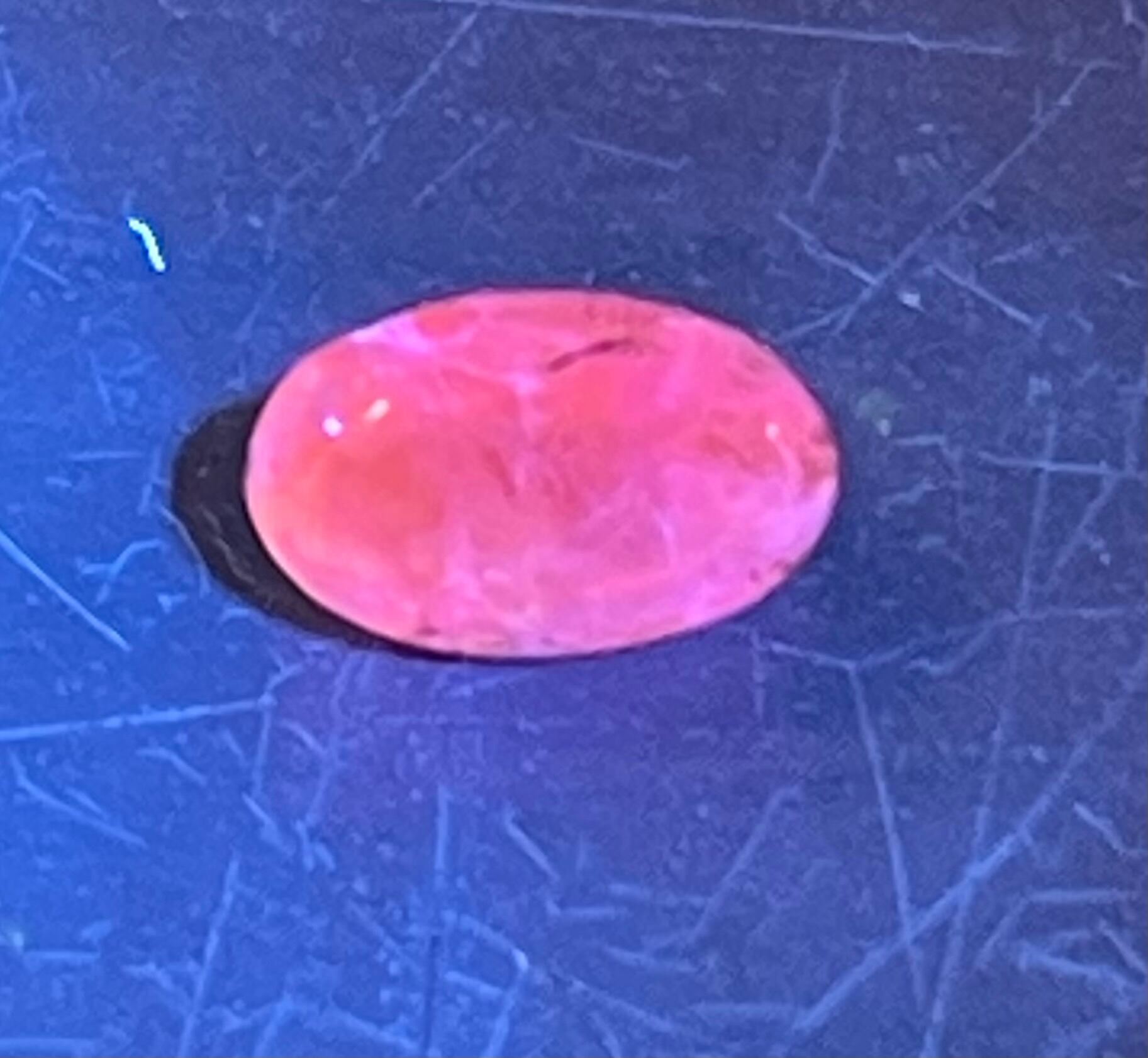 オーバルカットです。鮮やかなピンク色の蛍光反応を示します。