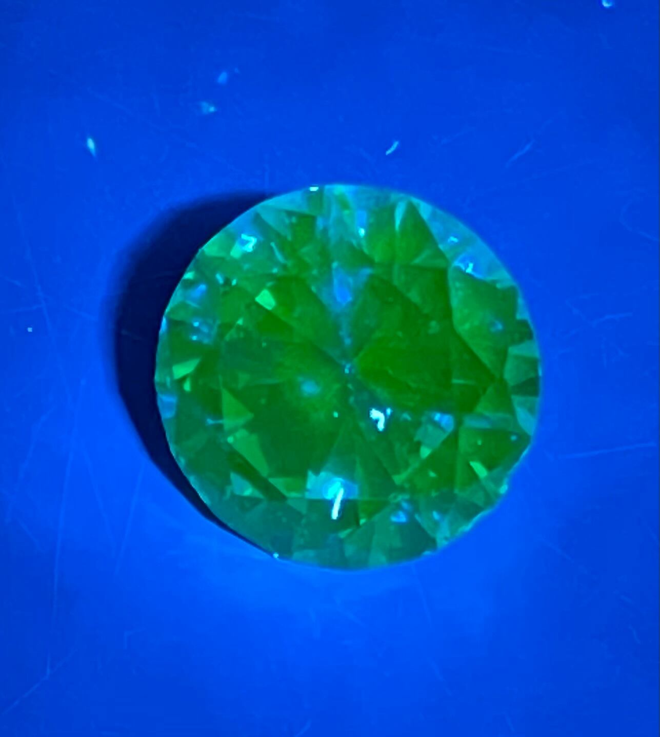 無色透明のキュービックジルコニア。黄緑色の蛍光反応を示します。