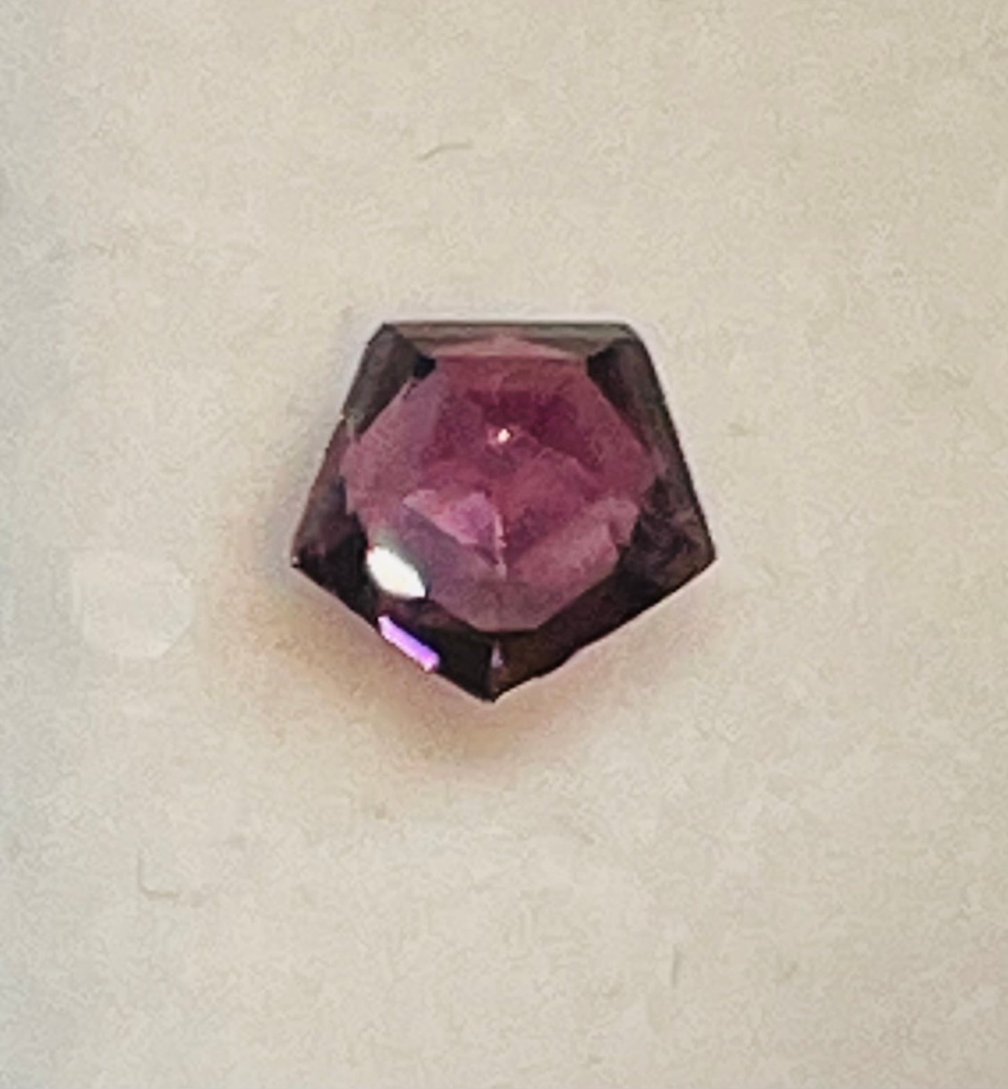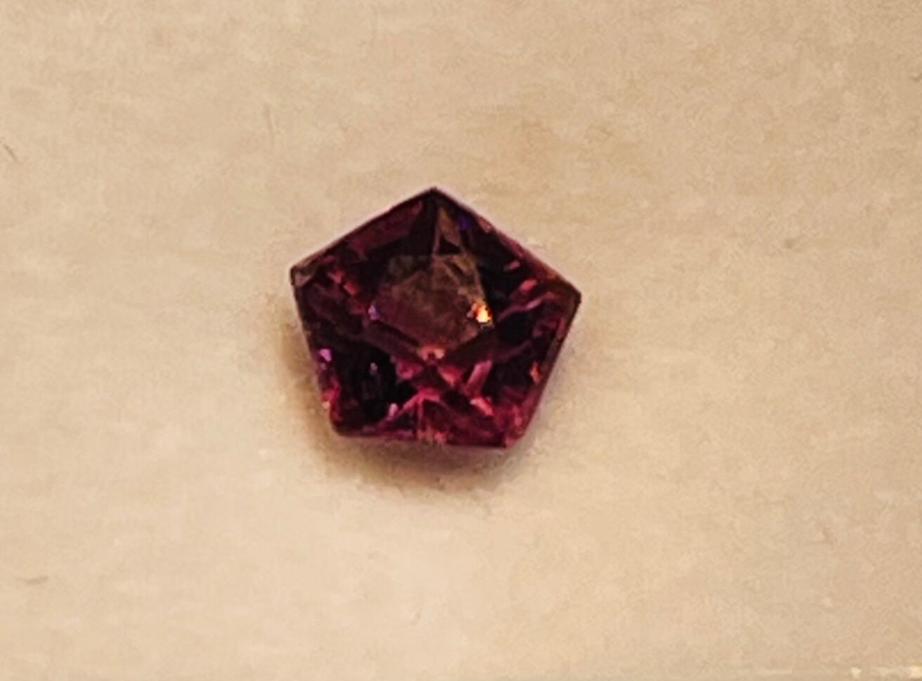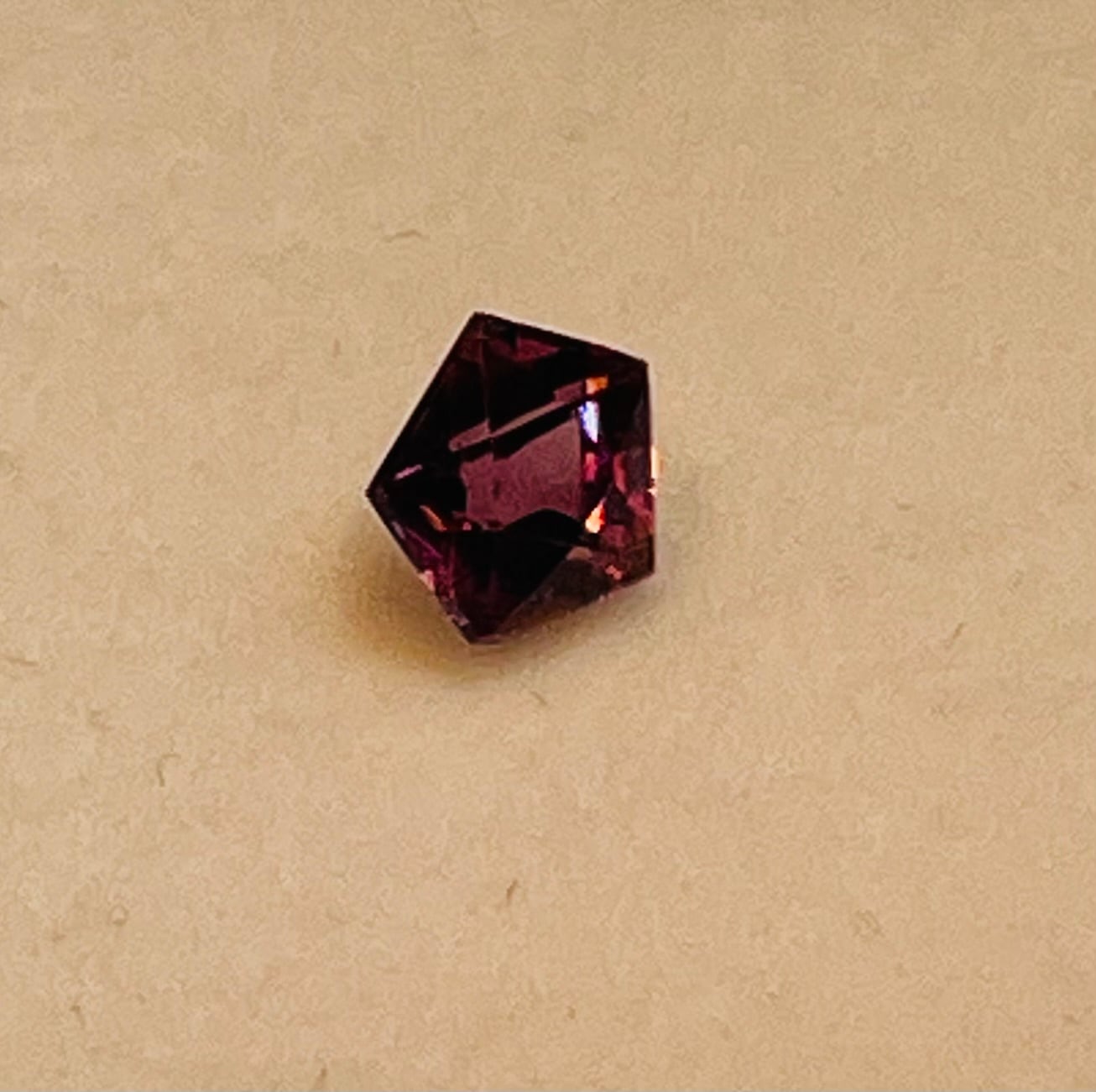 赤ワインカラーのパープルスピネル。かわいらしいペンタゴンカット。